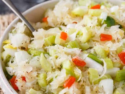 Tangy and sweet! This delicious salad recipe has crisp veggies, sauerkraut tossed in a sweet dressing. Delish!