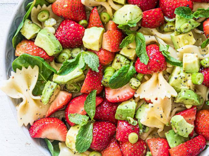 Sweet, tangy, colorful, and fresh Strawberry Avocado Pasta Salad with poppy seeds is ready in under 20 minutes and a great side dish or mains for everyday eats or holiday gatherings.