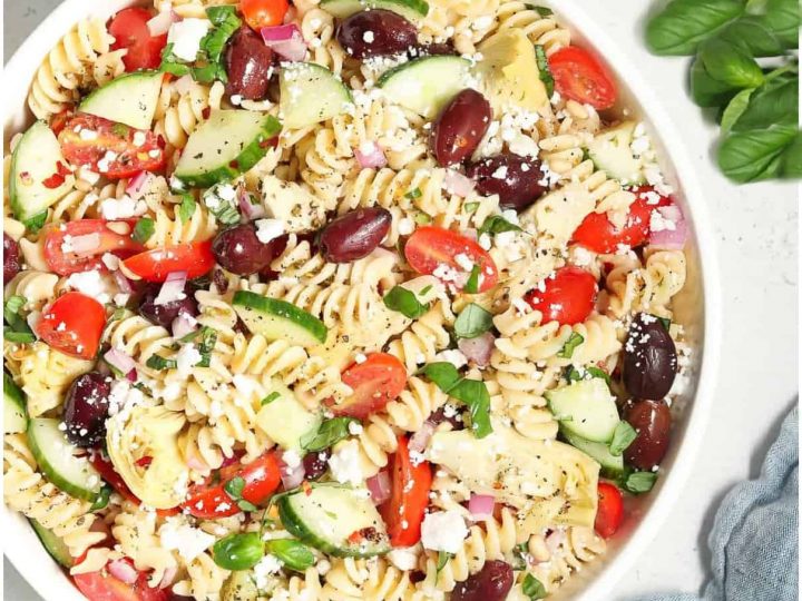A delicious and refreshing Greek pasta salad recipe made with feta, cucumbers, tomatoes and fresh herbs in only 20 minutes! It's WW friendly at only 5 points on the blue plan. Perfect summer BBQ or potluck idea!