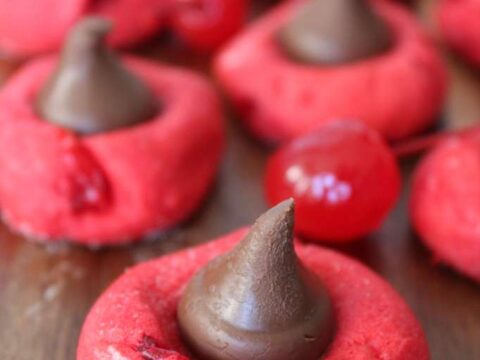Cherry sugar cookies topped with a Hershey’s Kiss. Tastes like a chocolate covered cherry, and looks gorgeous on Christmas cookie trays!