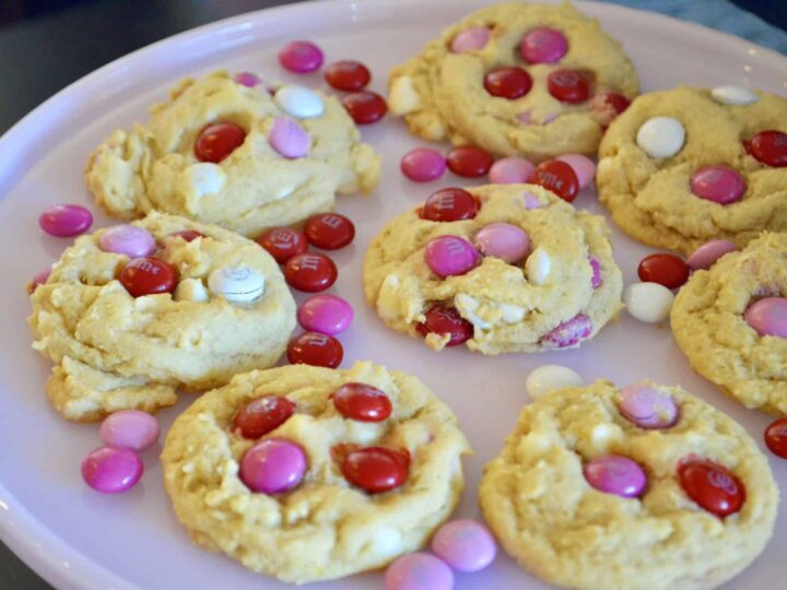 The BEST Valentine’s Day M&M Cookies recipe out there! Soft batch cookies made with Valentine M&M’s and vanilla pudding mix.