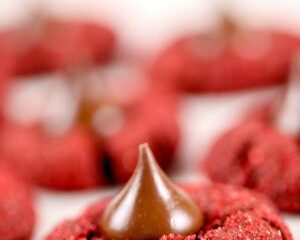 Chewy Red Velvet Cookies topped with a Hershey’s Kiss: Your Favorite Christmas Cookie, all dressed up for Valentine’s Day.