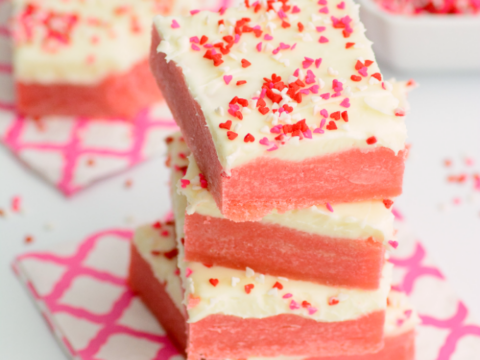 These lovely Valentine Sugar Cookie Bars are super delish, and the perfect sweet treat for the one’s you love this Valentine’s Day. Tender sugar cookie bars are tinted pin and frosted with a yummy cream cheese frosting. Add a festive touch with some pink and red sprinkles.