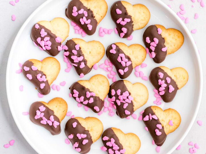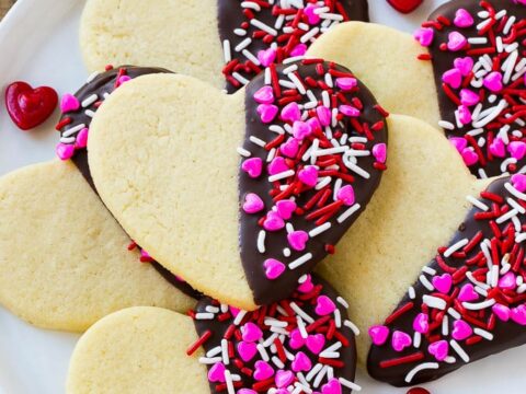 These easy heart cookies are made with a no-chill butter cookie dough! They’re dipped in chocolate and decorated with sprinkles!