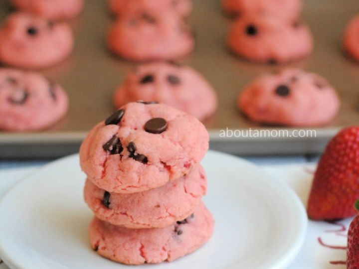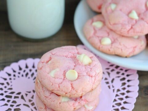 Cake mix recipes make for a lot of quick and simple treats. They take almost no time to prep and there’s really no limit to what you can do with them- add-ins, colors, flavors… frosted, not frosted… These Strawberry Cake Mix Cookies with White Chocolate Chips are a fun reminder of summer but also perfect for a Valentine’s Day treat!