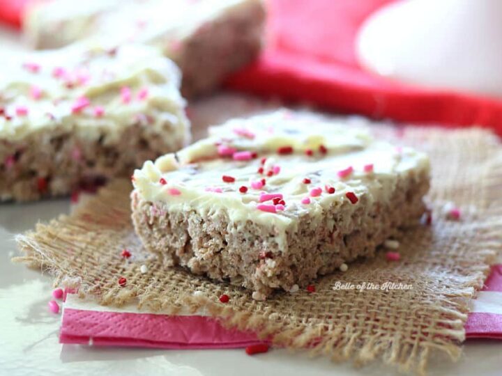A fun twist on the classic rice krispie treat made with chocolate strawberry marshmallows, and topped with a creamy layer of white chocolate. These are the perfect treat for Valentine’s Day, or any day!