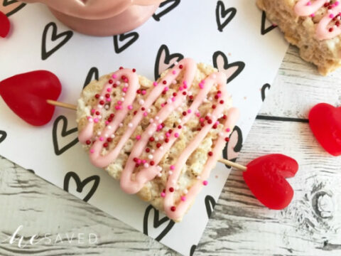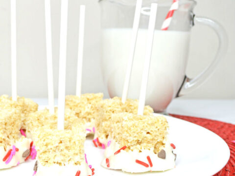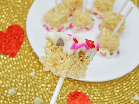 These Valentine’s Day Rice Krispie Pops are not only easy to make, they’re also fun to make. Your kids will have fun dipping the pops into melted white chocolate and sprinkles.