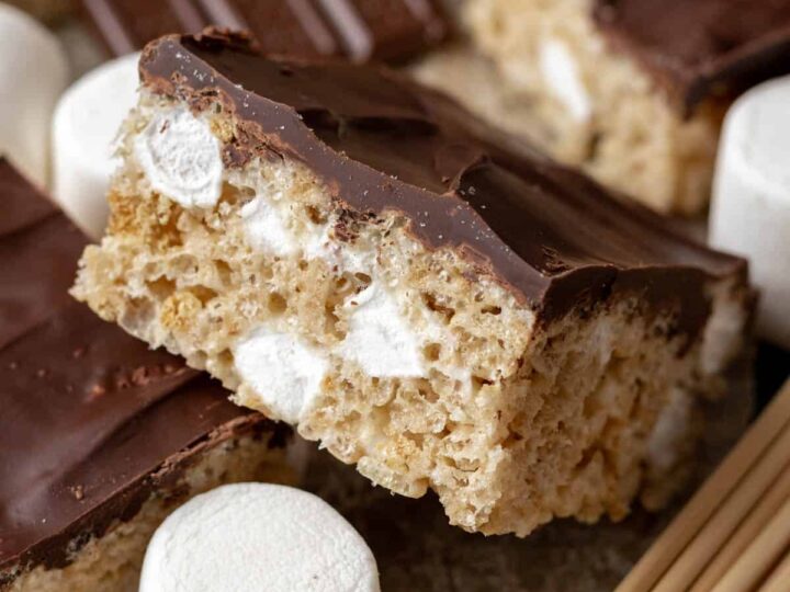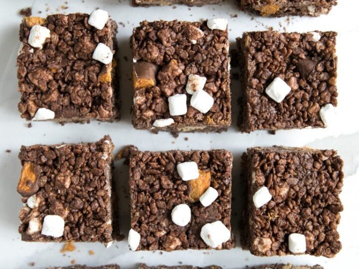 These s’mores Rice Krispie treats are the perfect dessert for Valentine’s Day! No need to start up the fire, just a quick no-bake, delicious dessert will do instead!
