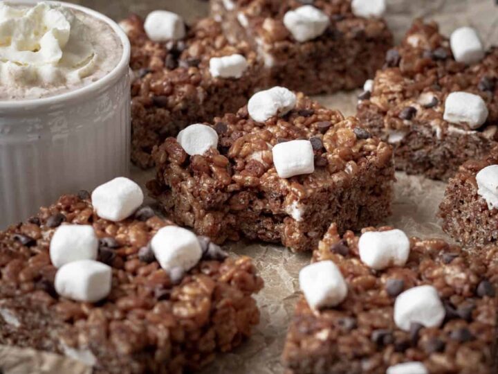 Hot chocolate Rice Krispie treats are the perfect wintertime dessert. Filled with cocoa chocolatey flavor and mini marshmallows, it’s everyone’s favorite drink in treat-form.