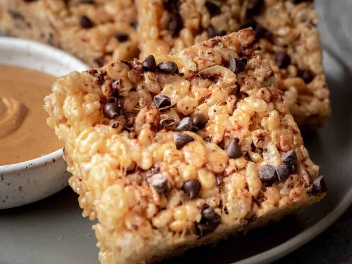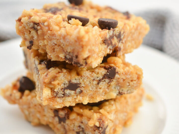 Crisp and chewy, these Keto Peanut Butter Rice Krispie Treats are almost better than the real thing! We used real, creamy peanut butter, sugar free chocolate chips, and low carb cereal to create a decadent treat that won’t kick you out of ketosis!