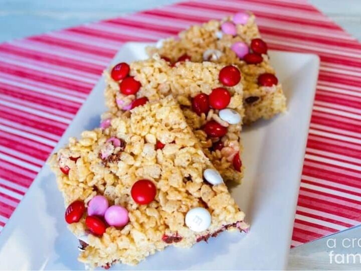 These Valentine’s Rice Krispie treats are soft, chewy, and loaded with M&M’s! Kids will love making these Rice Krispie Treats--a perfect treat to bring to school or Valentine’s day parties.