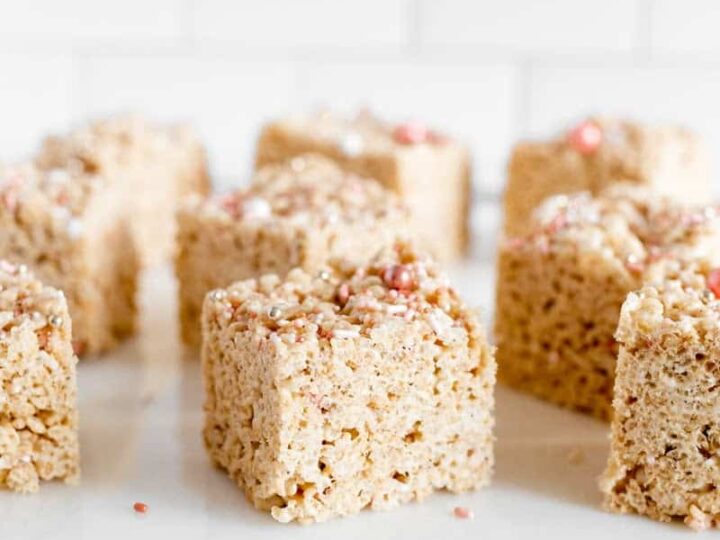 Brown Butter Rice Krispie treats are the perfect treat for Valentine’s Day. Add some fun little pink or pink and red sprinkles for a more festive look!