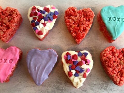 A classic rice krispies treats recipe, cut out into hearts, then dipped in vanilla-flavored candy coating and topped with sprinkles.